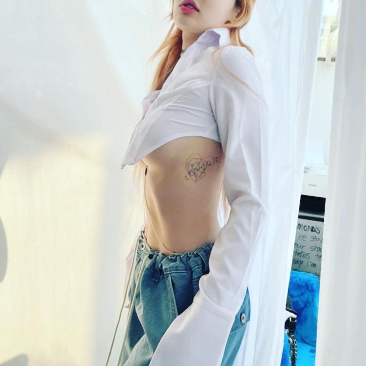하트 속 뽀뽀하는 귀여운 연인의 모습을 가슴 바로 아래 옆구리 부근에 새긴 현아. 도안과 위치 모두 커플 타투에 제격일 듯! SPOT 3. 가슴 아래