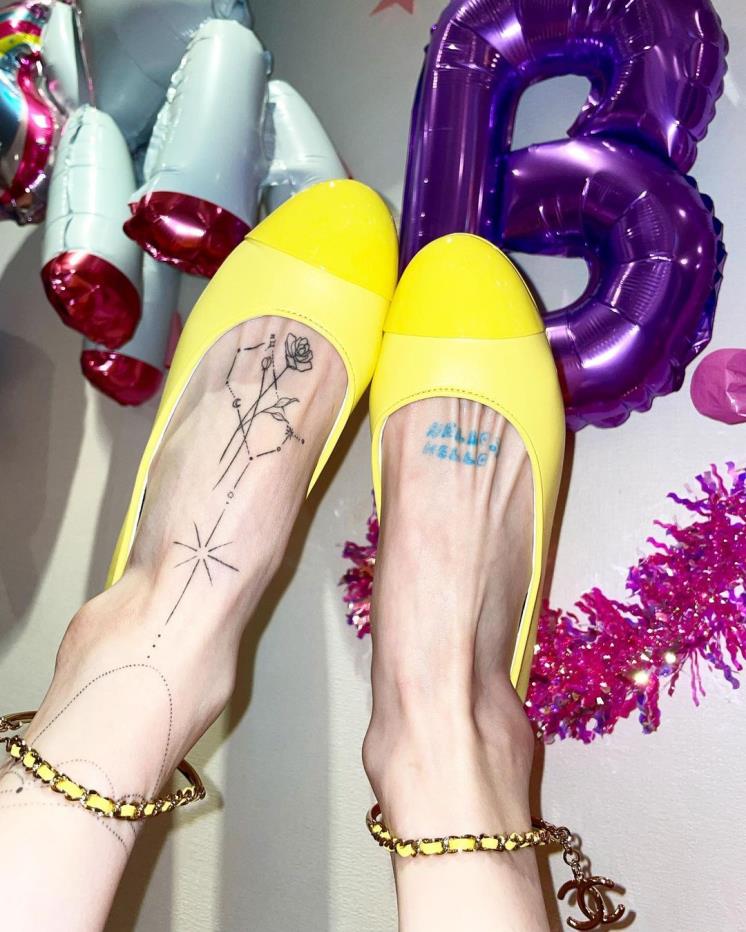 샌들과 슬리퍼 착용이 잦은 여름이면 특히 매력도 급상승! 발등과 발목에 발찌, 빛, 장미, 레터링 등 다양한 모양을 조화롭게 믹스해 새겨 넣은 현아. SPOT 2. 발등 & 발목