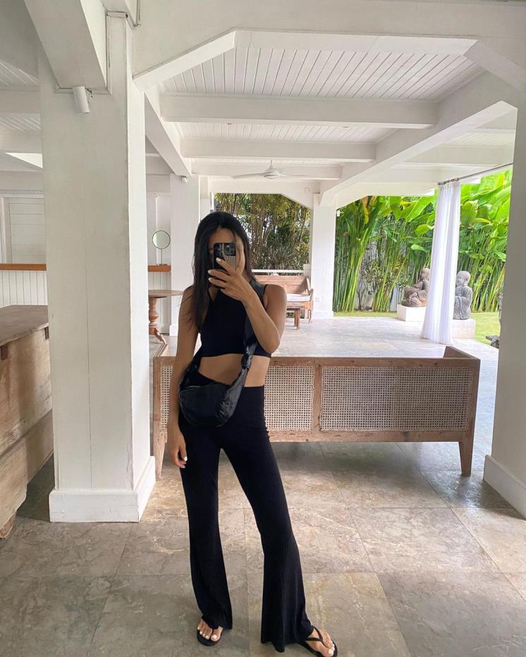 ‘발리댁’ 가희의 카리스마 넘치는 블랙 스타일링. 발리에서의 일상을 공유 중인 가희는 탠한 피부와 함께 건강미 넘치는 비주얼을 자랑한다. 그는 군더더기 없는 블랙 크롭톱과 플레어 팬츠로 올 블랙 셋업을 연출했다. 여기에 블랙 크로스백까지 더해져 한층 깔끔하며, 작은 실버 액세서리를 포인트로 추가해주면 시크룩 완성!