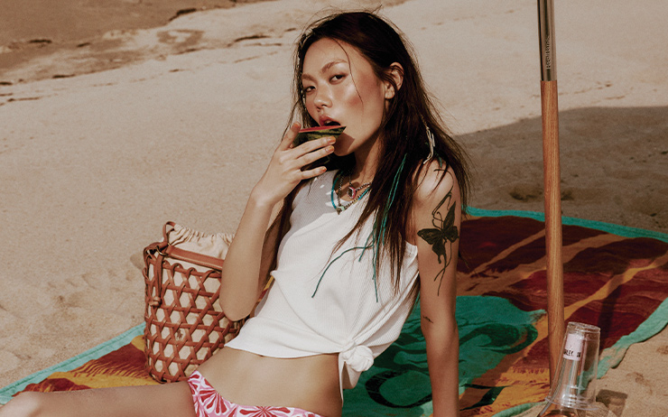 비키니 톱 2만4천원대 H&M. 선글라스 39만원 살바토레 페라가모. 어깨에 걸친 스웨트셔츠 25만원대, 샌들 가격미정 모두 폴로 랄프 로렌. 네트 백 15만5천원 롱샴. 백 안의 라피아 해트 가격미정 끌로디 피에로.