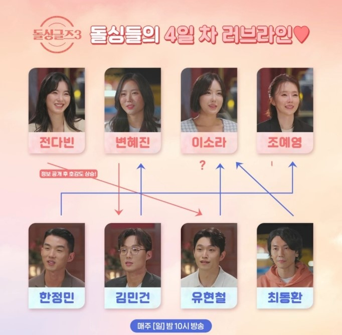 4명 중 3명의 여자들에게 첫인상 투표를 받을 만큼 인기가 많았던 한정민. 그런 그를 선택하지 않은 단 한 사람이 바로 조예영이었다. 한정민 역시 첫인상 4위로 조예영을 선택했었다. 그러던 그들이 4회이후 가장 뜨거운 커플로 떠올랐다. 남사친, 여사친을 두는 것을 이해할 수 없다는데 의견을 같이한 것을 시작으로 1:1 데이트, 밤산책 데이트에 이어 포옹까지 하며 서로의 마음을 확인한 것. 대화도 없던 이들이 마음을 결정하기까지 그다지 시간이 걸리지 않았기에 영상을 본 패널들도 입틀막을 금치 못했다. 이런 급발진이 돌싱글즈의 매력이 아닐는지?