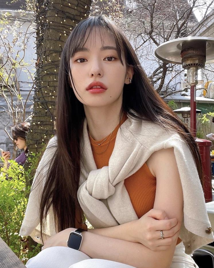 다크 오렌지 컬러의 탑에 아이보리 카디건을 둘러 입은 그녀의 컬러 매치 센스!