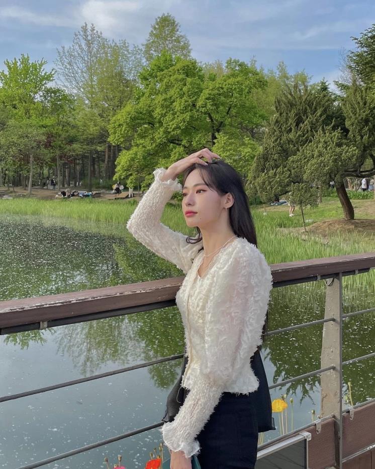 디테일이 있는 퍼프 블라우스가 그녀의 긴 흑발과 잘 어울린다.