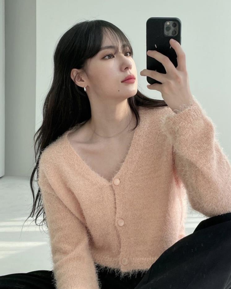 살구색 크롭 니트가 사랑스러우면서 힙한 느낌이다.