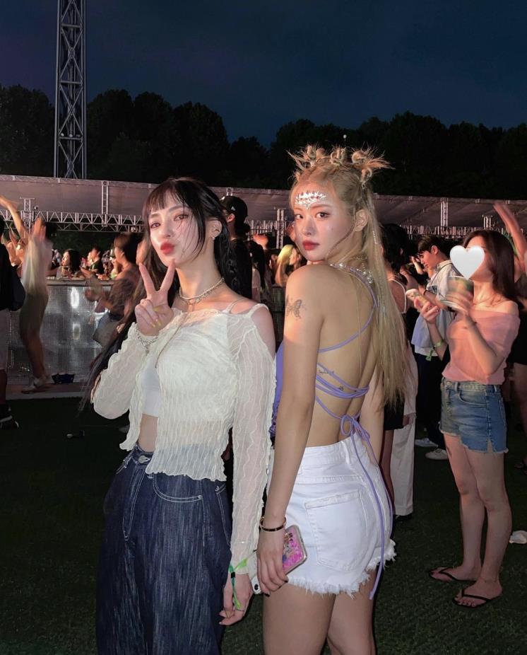 페스티벌룩으로 화이트 오프숄더 블라우스에 데님을 매치해 힙하면서 편한 룩을 완성한 그녀.