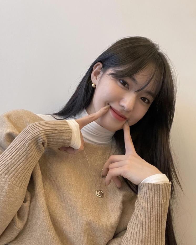 베이지 컬러의 니트에 화이트 터틀넥을 레이어드해 룩에 포인트를 줬다.