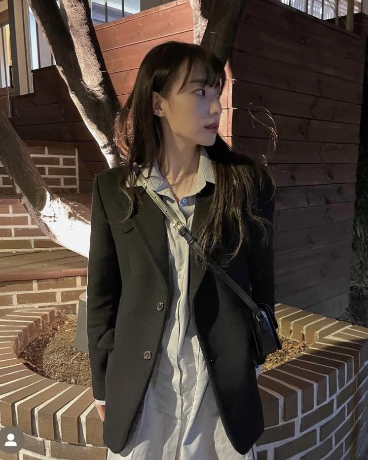 블랙 재킷에 롱셔츠를 이너로 착용해 쿨한 느낌으로 연출했다.