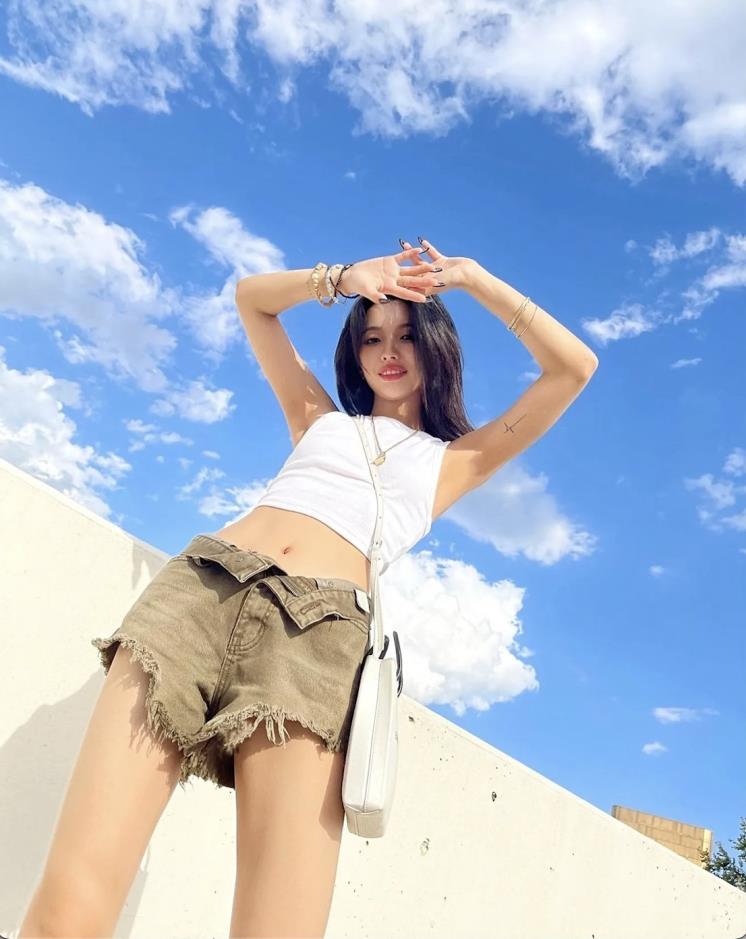 하의 안감이 슬쩍 노출된 화려한 패턴의 데님 쇼츠를 입은 김민주는 스터드 장식의 벨트를 더해 잘록한 허리 라인을 강조했다. 멀티 컬러의 크로셰 톱 덕분에 자유분방한 분위기는 덤!