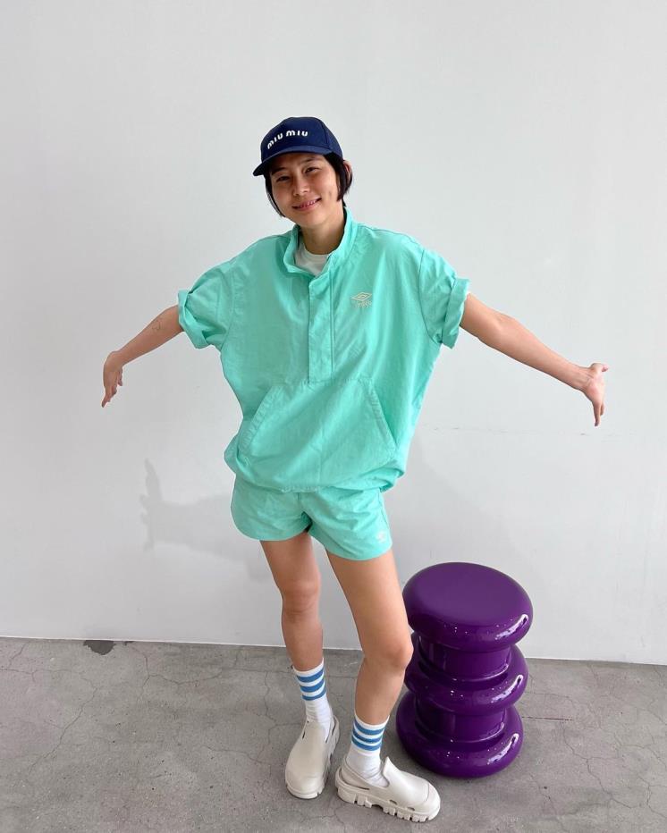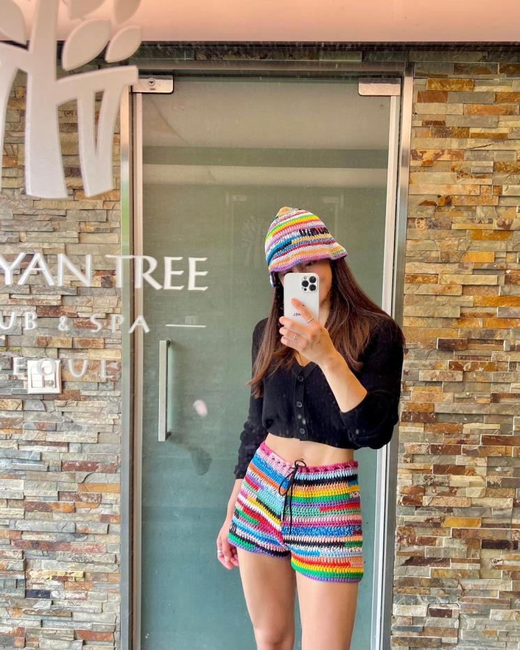 이시영은 무지개가 떠오르는 알록달록한 크로셰쇼츠로 시선을 사로잡았다. 상의는 이와 상반대 블랙 크롭 카디건을 매치해 모자와 쇼츠가 더욱 돋보였다. 장마철은 물론 스윔웨어 위에 레이어드 하기도 좋다.