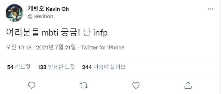 케빈 오는 트위터를 통해 자신의 MBTI가 INFP임을 밝힌 적이 있다. 공효진은 세 번을 검사해도 똑같이 ENFP가 나왔다고. 평소 이상형으로 ‘세상 물정에 밝고 요령있는 사람’을 꼽아온 그는 자신이 진행하는 라디오 프로그램에서 ‘열 살 연상 vs 열 살 연하’ 중 선택하라는 질문에 열 살 연상을 고르기도 했다. 이미 그때부터 공효진과 연인이었는지는 알려지지 않았지만, 사교적이고 활동적이며 강인한 여성이 이상형이라고 말해와 공효진과 겹치는 부분이 많다는 것을 알 수 있다. 무엇보다 인프피와 엔프피인만큼 둘의 비슷한 성향에서 매력을 느낀 것은 아닐는지?