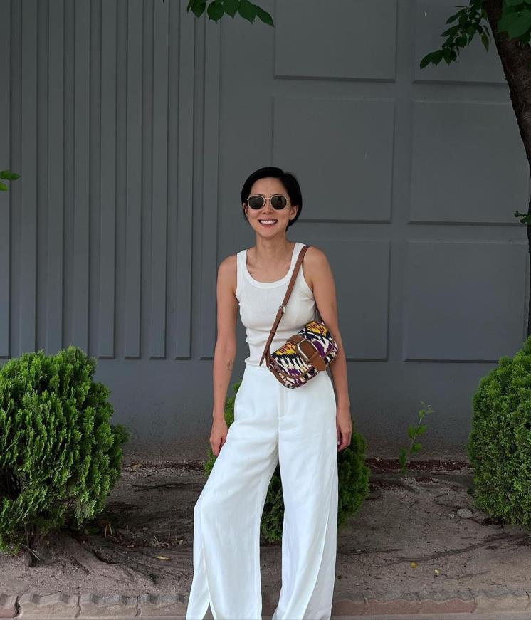 화이트 탱크톱과 슬릭 팬츠로 길쭉한 각선미를 돋보이게 스타일링한 김나영. 베이직하게 도전할 수 있는 올 화이트룩! 특히 탱크톱은 이번 2022FW의 키아이템이기 때문에, 여름이 끝나기 전 필수인 아이템!