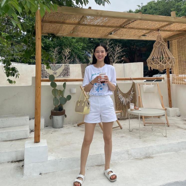 화이트 룩에 도전하기 가장 쉬운 방법은? 바로 반팔과 쇼츠를 매치하기! 장희령은 누구나 집에 있을법한 티셔츠와 쇼츠, 샌들로 화이트룩을 완성했다. 목걸이, 가방으로 약간의 포인트를 더하는 것도 잊지말기!