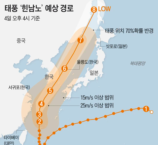 기상청은 5일 오전 4시 힌남노가 오전 9시 강도 ‘매우 강’인 상태로 제주 서귀포시를 지날 것으로 전망했다. 힌남노는 6일 오전 9시 강도 ‘강’ 상태로 부산 북북동쪽 육상에 상륙할 것으로 보인다. 태풍의 최근접 시기는 6일 이른 새벽 제주도와 아침 경남권 해안으로 예상된다. 이후 힌남노는동해상으로 빠져나가 오후 3시 울릉도, 오후 9시 일본 삿포로 해상에 이를 것으로 예보됐다.