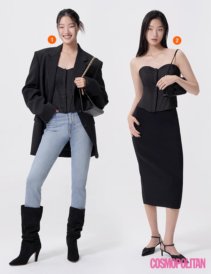 재킷 가격미정 스포트막스. 데님 팬츠 11만원 앤아더스토리즈. 체인 백 1백53만5천원 만수르 가브리엘. 슬라우치 부츠 가격미정 H&M.