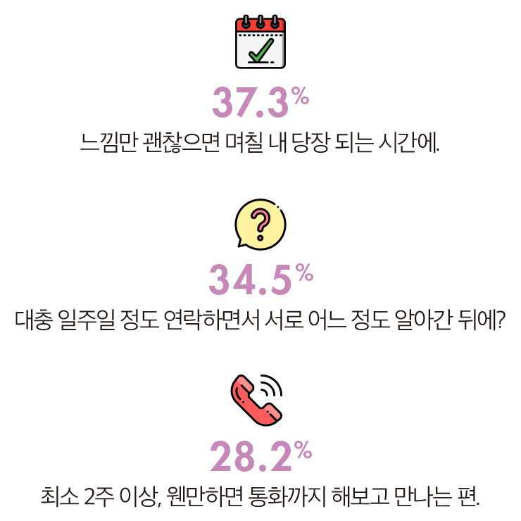 Q 처음 알게 된 사람과 만나기 전까지 연락을 주고받는 기간은 얼마가 적당하다고 보나요?