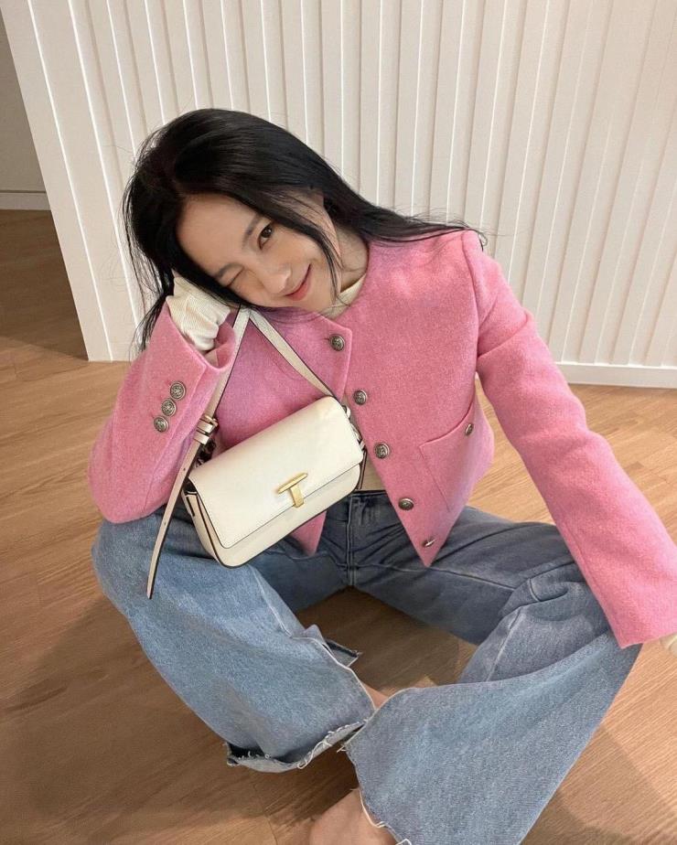 효민은 나연처럼 핑크 톱, 데님 팬츠를 스타일링했지만 또 다른 느낌을 완성했다. 톤 다운된 파스텔 핑크 노카라 재킷을 선택해 포멀하면서도 스타일리쉬하게 룩을 마무리! 깔끔한 숄더백까지 함께 매주면 출근, 미팅, 소개팅 등에서 활용하기 좋은 캐주얼 오피스 룩 완성입니다~.