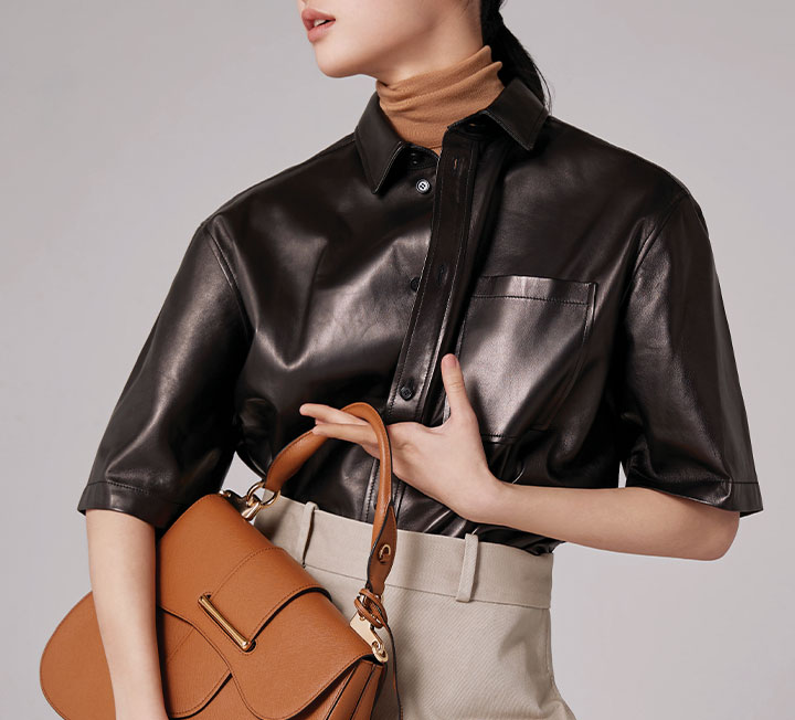 효민은 허벅지까지 내려와 코트의 느낌을 풍기는 짙은 브라운 재킷을 선택했다. 여기에 재킷과 비슷한 브라운 미니백을 함께 매치! 그리고 볼드한 골드 반지, 귀고리를 더해 가을의 컬러를 모두 담은 풍성한 룩을 완성~