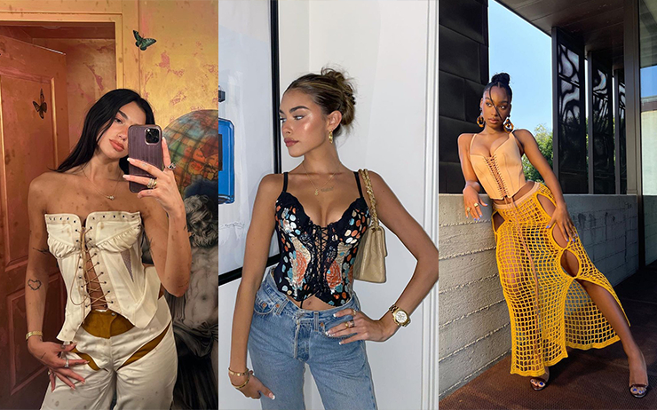 파란 가을 하늘에 잘 어울리는 핑크 컬러 포인트가 들어간 러블리 백 오픈 코르셋. 평소에 코르셋이 어렵다고 생각했다면 벨라 하디드처럼 데일리한 데님, 블라우스에 부담스럽지 않게 매치해보자. 벨라 하디드