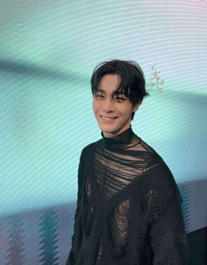 파격적이고 새로운 무대 의상으로 항상 팬들을 설레게 만드는 문빈. 상의가 아슬아슬하게 드러나는 니트를 선보였다. 컷아웃 된 프린지 디테일 위로 시스루 쉬폰 소재가 덮어져 있는 니트가 그것! 드러내면서도 드러내지 않은듯한 제품을 찾고 있다면 시도해보자.