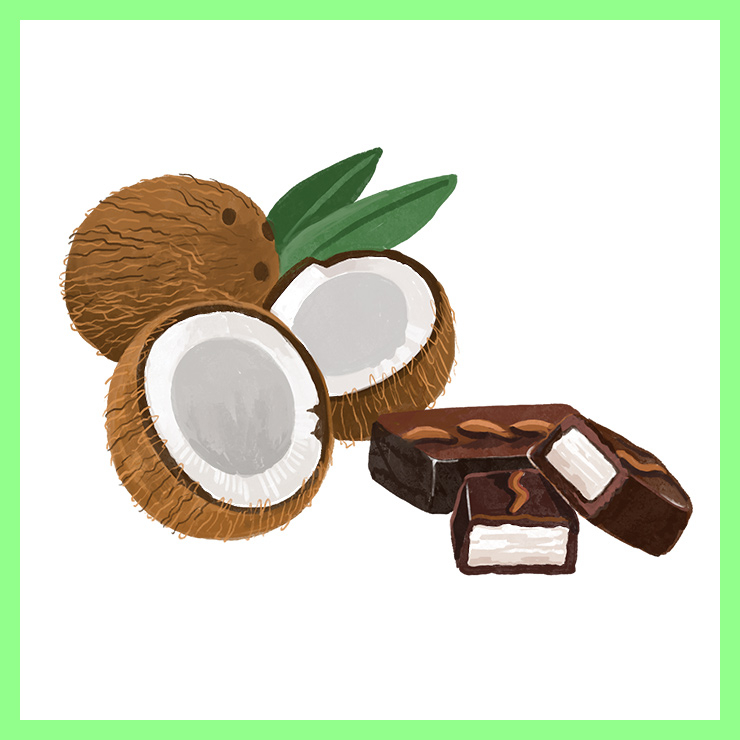 」 ‘코코넛’이라는 글자를 보면 지나치지 못한 지 오래됐다. 15년 전쯤, 태국 깐짜나부리의 노점이 늘어선 길가에서 우연히 코코넛 젤리를 맛본 이후 코코넛 탐구 생활이 시작된 것 같다. 코코넛 밀크 위에 에스프레소 셰이킹이 올라간 테일러커피의 코코 프레도, 화이트 럼에 코코넛을 으깨어 숙성시킨 말리부, 굵은 코코넛 슬라이스가 들어 있는 밀크 초콜릿 바운티, 코코넛 밀크가 가득 들어간 그린 커리, 트리헛 시어의 코코넛 라임 스크럽과 로라 메르시에의 아몬드 코코넛 밀크 수플레 바디 크림까지. 코코넛이 들어간 새로운 무언가를 발견하면 격양된 마음으로 먹어보고, 마셔보고 또 발라본다. 코코넛 향은 호불호가 갈린다는 것을 잘 알기에 자신 있게 추천하기보다는 나만의 은밀한 즐거움으로 남겨두고 있다. 코코넛은 과육을 그대로 먹거나 주스로 만들기도 하지만 과자나 잼, 각종 디저트와 요리의 재료가 되기도 하고, 화장품을 만드는 데도 쓰이니 아직도 나에겐 무궁무진한 시도가 남아 있다. 그것이 더없이 즐겁다. 정멜멜(포토그래퍼)