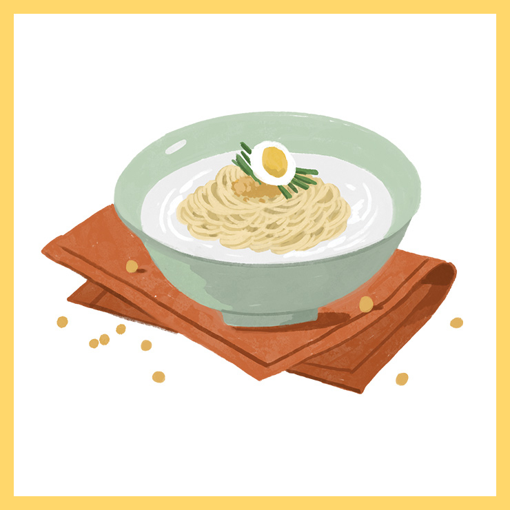 독립하고 나서 무언가 직접 만들어 먹는 일은 나에게 큰 행복을 가져다주는 순간이 됐다. 재료 손질부터 완성된 요리를 그릇에 올리기까지의 조리 과정이 투명하다는 것도 마음에 든다. 몇 년 전 채식을 실천하면서부터 직접 요리하는 날이 늘었고, 식성의 변화도 자연스럽게 찾아왔는데 그때부터 즐겨 먹게 된 것이 있다면 콩이다. 누군가에겐 외면받는 콩이지만, 퍽퍽하면서도 부드러운 식감과 고소한 맛이 나에게는 매력적으로 다가왔다. 콩으로 만든 여러 음식 중에서도 하나를 꼽자면 단연 콩국수(참고로 소금을 넣어 먹는 소금파다. 한식에 단맛은 있을 수 없다!). 언젠가 진주회관에서 먹었던 충격적인 맛의 콩국수를 떠올리며 만들어봤던 것이 아마 콩국수를 사랑하게 된 결정적인 순간이었을 거다. 그렇게 콩국수에 푹 빠진 나는 콩을 직접 불리고 삶은 후, 곱게 갈아내 콩물을 만드는 수고를 마다하지 않는다. 잘 삶은 면에 콩물만 부어내면 진주회관 부럽지 않은 콩국수가 완성되니 이보다 완벽한 식사가 있을까? 출출할 때 휘리릭 라면을 끓여 먹는 것처럼 나에게 콩국수는 쉽게 만들 수 있는, 하지만 정성스러운 한 끼다. 배아름(요가 강사)