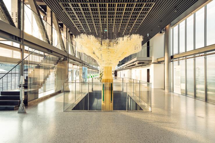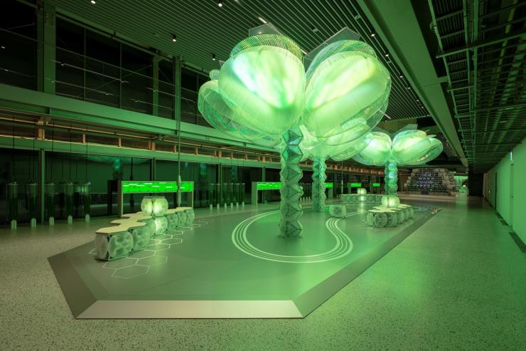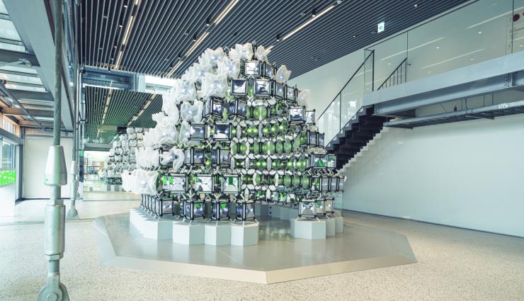로봇 3D 프린터로 제작한 10m 높이의 인공 나무, ‘트리 원.’ 나무 모양의 바이오 플라스틱 구조 안에 스스로 광합성 작용을 하는 알게가 주입돼 있어 실제 자연 상태의 나무처럼 본체에 탄소를 저장하고, 대기에 산소를 공급한다. 이 작품은 그 자체로 살아 있는 나무로서 자연을 상징하는 동시에 다른 한편으로는 AI 설계로 탄생한 새로운 종류의 기술 생명을 나타낸다.