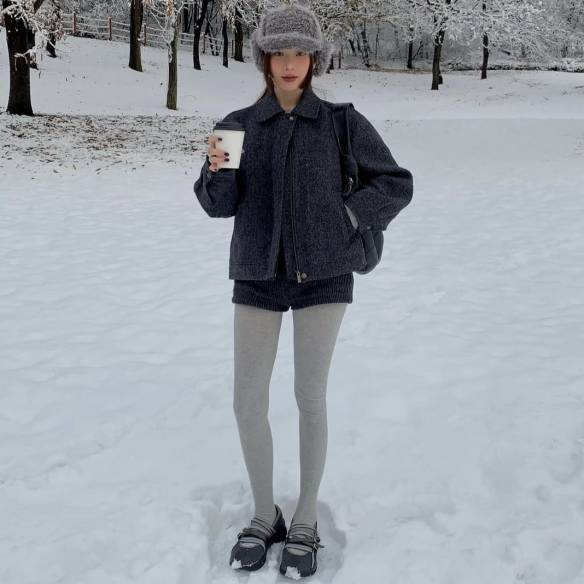 패딩에 하의실종 패션 그리고 레그 워머와 화이트 스니커즈를 매치한 나연. 레그워머에 같은 톤 스니커즈를 매치해 다리가 길어보이도록 연출했어요.