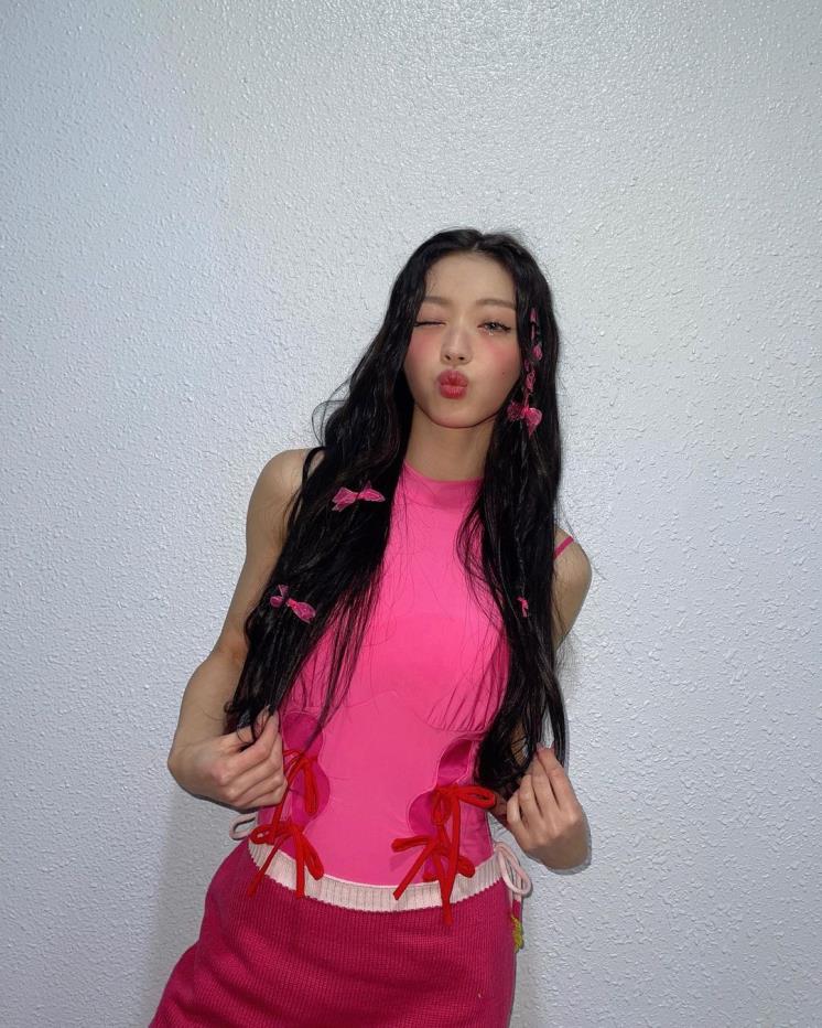 핑크 극혐러도 반할 수밖에 없는 유아의 뷰티 룩! 머리를 촘촘히 땋은 브레이드 헤어에 핑크 끈을 이용해 리본을 만들어 포인트를 주었다. 메이크업 또한 핑쿠 그 잡채인데, 눈 밑부터 광대까지 블러셔를 얹어주었기 때문! 근데 살짝 붉은 기가 도는 브라운 음영 메이크업과 조화를 이뤄 과하지 않고 자연스럽게 녹아들어 아주 굿~. 여기에 눈 밑에 파츠를 붙어 영롱한 너낌을 한 스푼 추가하고 체리를 연상시키는 핑크 레드 립으로 마무리하니 과즙미가 팡팡~터진다.