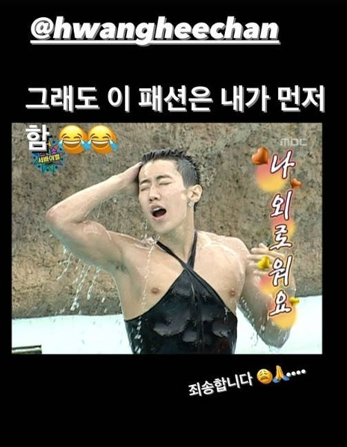 가수 박재범은 인스타그램 스토리에 “그래도 이 패션은 내가 먼저”라며 과거 MBC 무한도전에 출연했던 짤을 올렸네요.