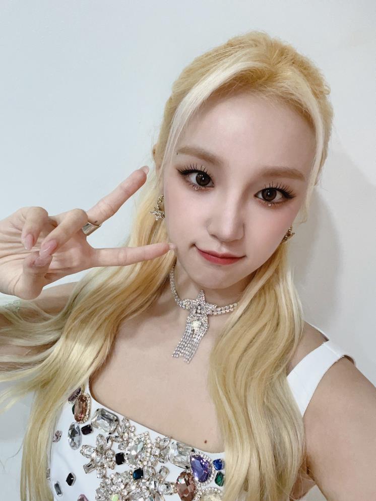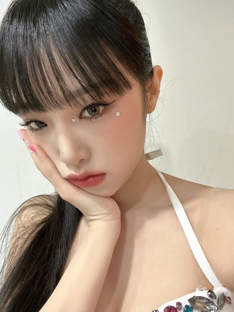 얇게 눈꼬리를 뺀 아이라인과 한 올씩 강조해준 속눈썹에 브라운 컬러의 렌즈를 더해 도도한 분위기를 더 짙게 완성한 최예나. 눈 앞머리와 광대 위쪽에 육각형 모양의 파츠를 붙여 시선 강탈 포인트를 더해주었다. 여기에 톤 다운된 딸기 우유 색상의 립을 풀립으로 칠하고, 머리는 포니테일로 묶어주니 시크미가 우주 끝까지 폭발해버렸다.