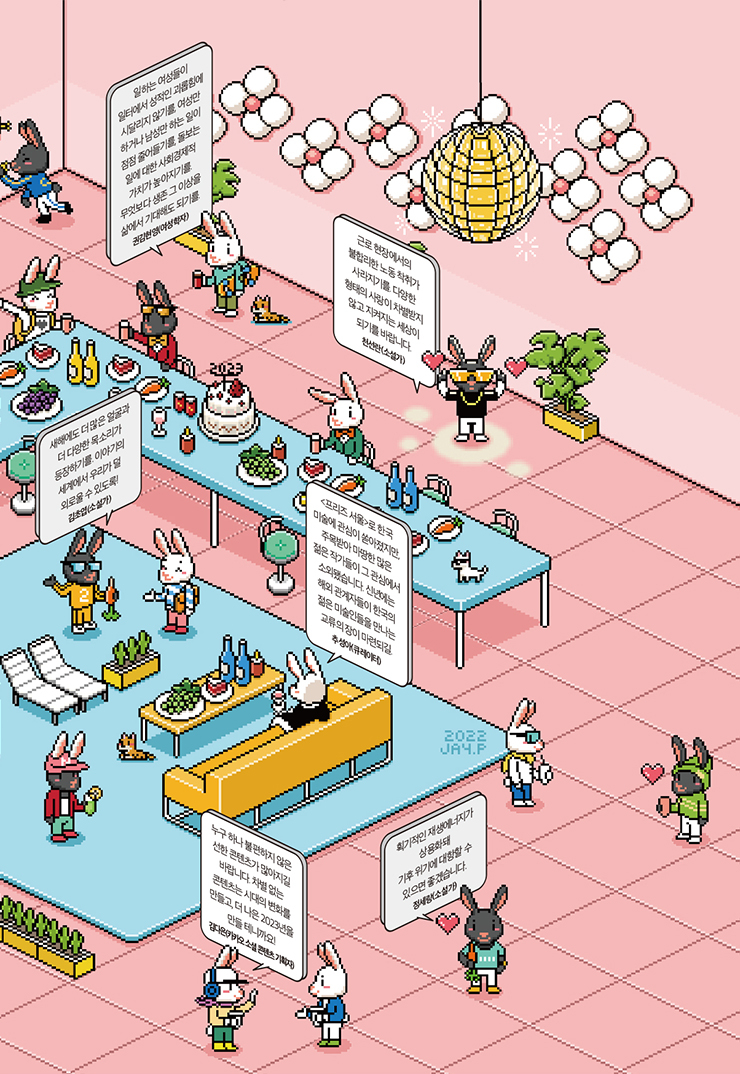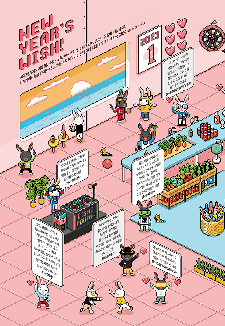 2023년 토끼의 해를 맞아 작가, 감독, 배우, 뮤지션, 스포츠 선수, 변호사, 유튜버, 개발자까지 각계의 여성들을 초대한 <코스모폴리탄> 메타버스 신년 파티. 새해에 우리가 바라는 것은?