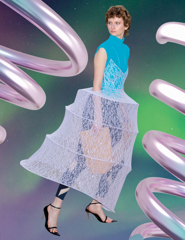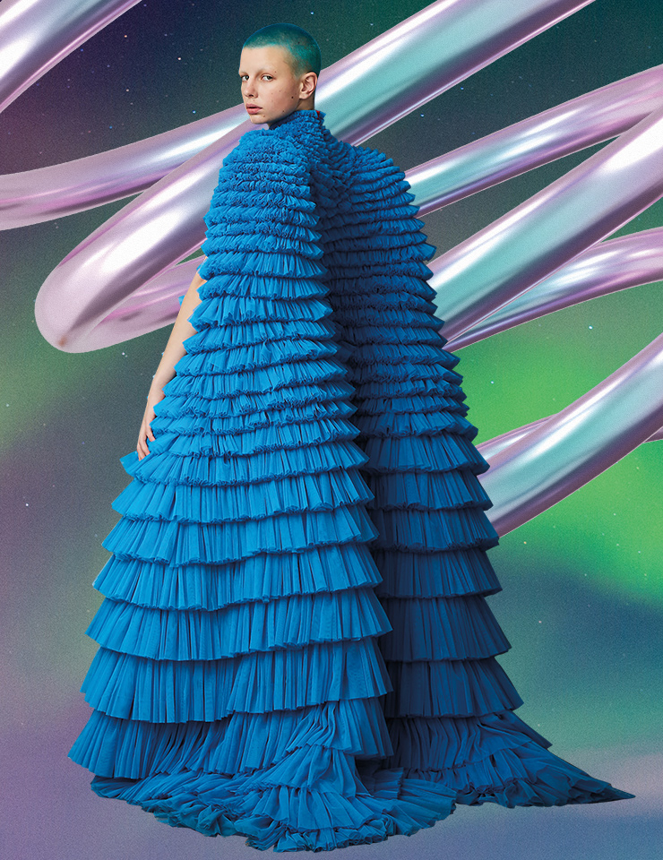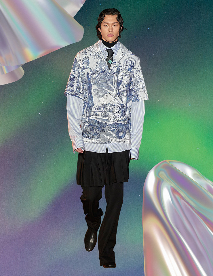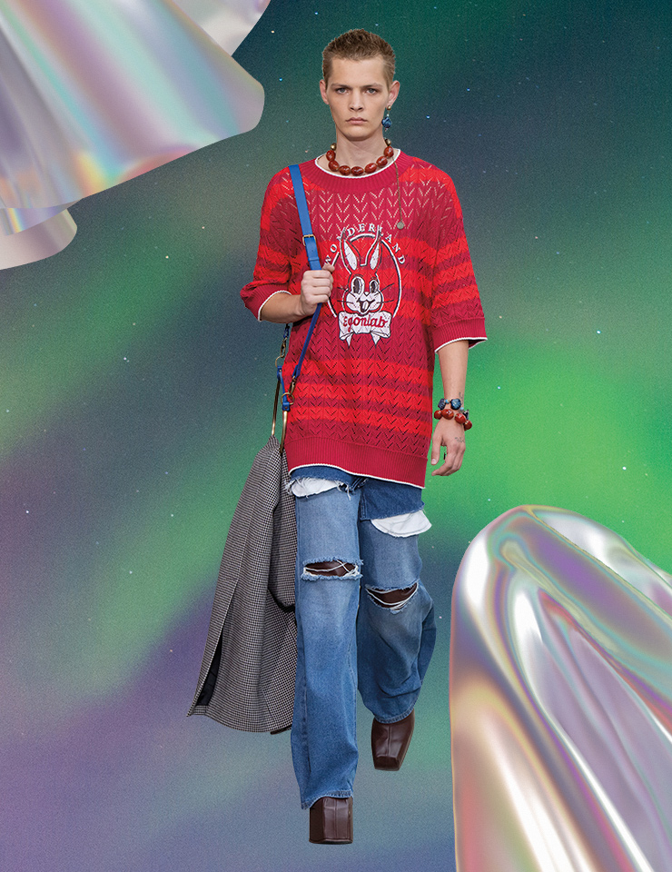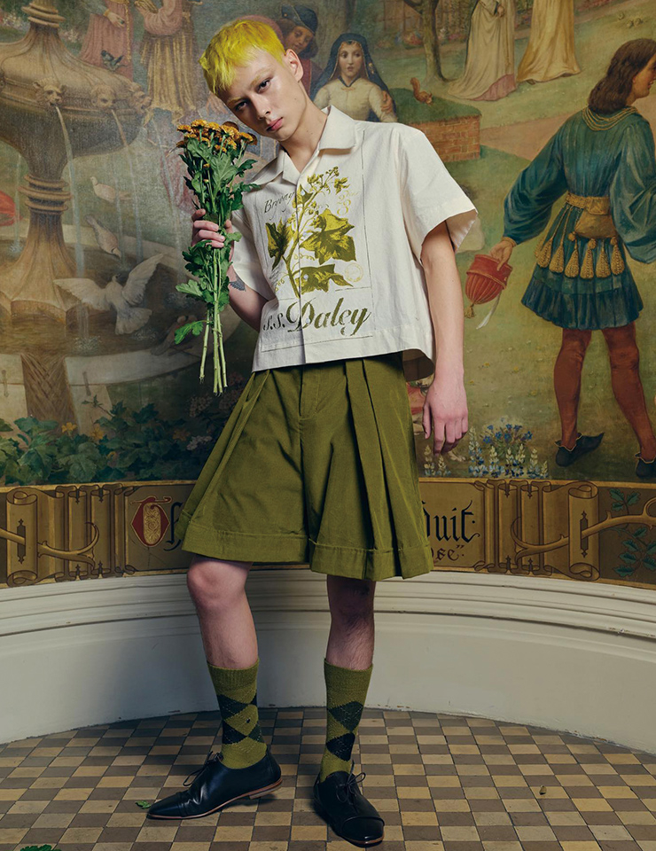 」LVMH 프라이즈의 2022년도 우승자인 디자이너 스티븐 스토키 달리. 해리 스타일스가 ‘골든’ 뮤직비디오에서 그의 옷을 입어 이미 전 세계에 이름을 알린 디자이너다. 2020년 웨스트민스터 대학 졸업 컬렉션을 시작으로 브랜드를 론칭한 그는 고향 리버풀에서 쌓은 어린 시절의 추억과 다양한 영국 사회의 전통을 주제로 서정미 가득한 젠더 플루이드 룩을 선보이고 있다. 재생 소재와 기부받은 잉여 원단을 활용해 컬렉션을 제작한다.