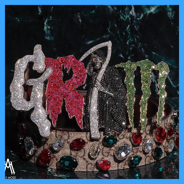 클래식한 구찌 모노그램 벨트 위에 보석으로 아이싱한 이 벨트를 보시라! 에이셉 로키의 벨트는 역시 다르다. 그의 대표곡 ‘GRIM FREESTYLE’의 ‘GRIM’에서 영감을 얻어 디자인된 버클과 형형색색 보석을 둘러 완성한 벨트는 주얼러 앨릭스 모스의 작품으로, 로버트 로런스 스타인의 소설 <구스범스> 표지 디자인에서 차용한 ‘G’와 동일한 스타일의 ‘R’, 거대한 낫을 든 저승사자 모습을 형상화한 ‘I’ 그리고 에너지 드링크 ‘몬스터’의 ‘M’ 로고를 조합해 패셔니스타다운 에이셉 로키만의 개성을 드러냈다! 모두 VVS 등급의 화이트, 그린, 블랙 다이아몬드를 비롯해 천연 루비와 18K 골드가 사용됐다고. 그래서 가격은 얼마? 약 4억6천만원! 에이셉 로키의 넘사벽 벨트