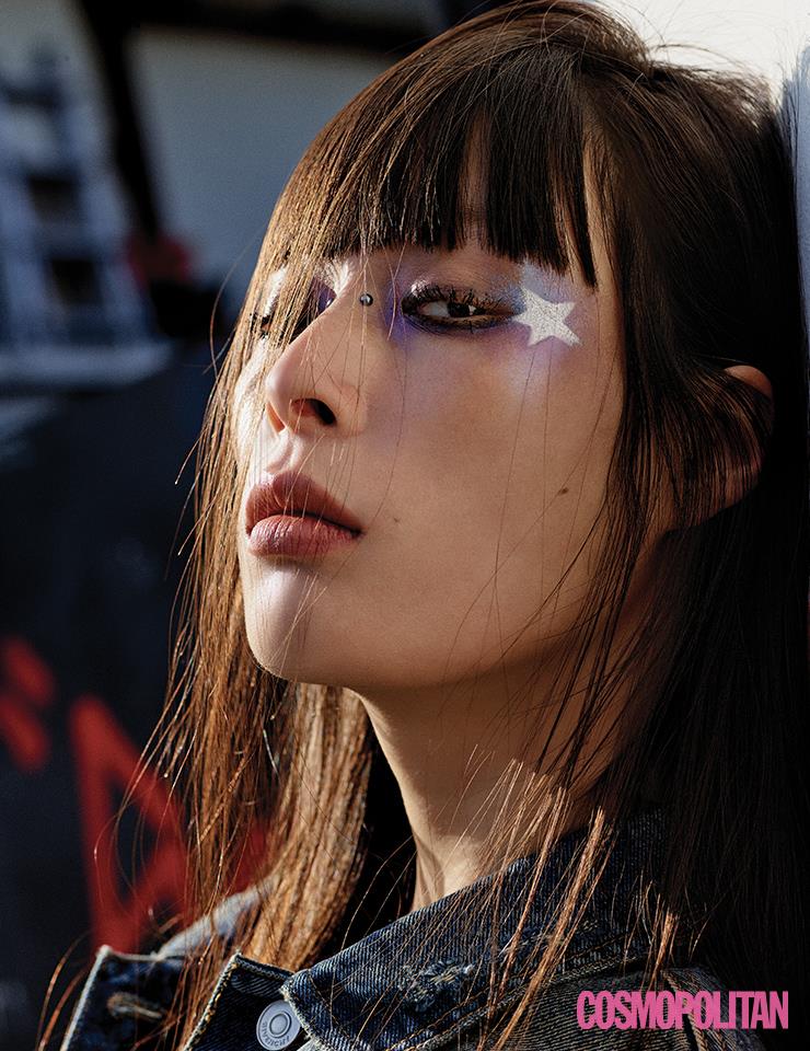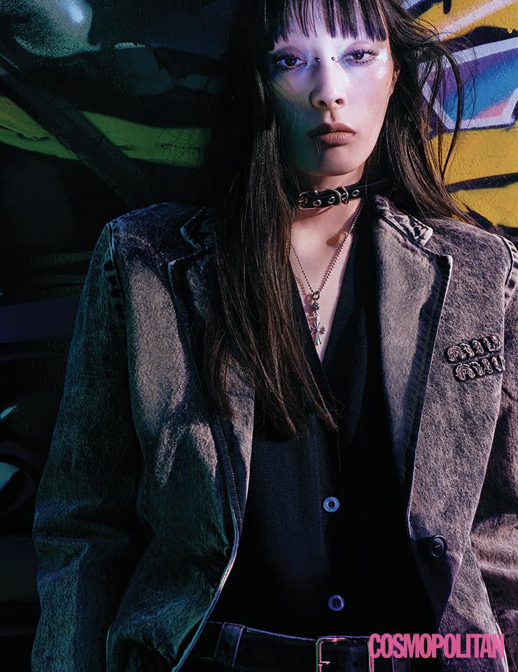 데님 재킷, 데님 팬츠, 니트 베스트, 벨트 모두 가격미정 미우미우. 초커 3만4천원 클럿스튜디오. 펜던트 목걸이 가격미정 크롬하츠. 피어싱 에디터 소장품.