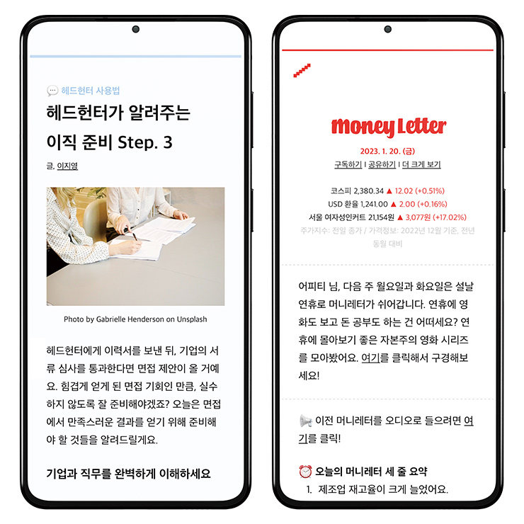 유튜브는 유저의 관심사를 수집해 알고리즘에 따라 콘텐츠를 추천하잖아요. 그런데 저희가 원하는 핵심 타깃과 경제 분야 알고리즘은 잘 맞지 않더라고요. 저희 고객은 미혼이거나 비혼이고 절반 정도는 독립을 했지만 나머지는 아직 부모님과 살며 큰돈을 쓸 일이 없는 사람들이에요. 하지만 기존의 경제 분야 알고리즘은 어느 정도 재산을 축적한 중장년을 대상으로 부동산, 주식 등 전형적인 재테크 위주로 작동하거든요. 뉴스레터는 정보를 전달하기에 효율적인 텍스트를 사용하면서도 추천 알고리즘에 방해를 받지 않아요. 독자는 메일 ‘구독’을 누르는 것만으로 재테크에 대한 심리적 부채감을 어느 정도 덜게 되고, 주기적으로 경제 관련 소식을 받아볼 수 있죠. 직장인들은 출근하자마자 메일함을 열어보는 게 루틴이기에 콘텐츠에 접근하기도 쉽고요.