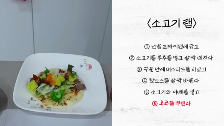 비프랩 역시 간단하다. 또띠아나 난에 머스터드, 칠리 소스를 바른 뒤 샐러드 채소를 올리고 데친 소고기를 올려 말아 먹어보시길. 속세의 맛이 펼쳐진다.