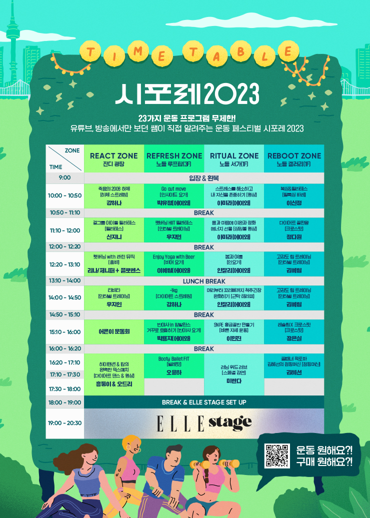 요가와 명상, 댄스, 줌바, 타바타, 필라테스, 스트레칭, 크로스핏, 점핑머신, 필록싱바레, 인터벌 트레이닝 등 총 23개의 다채로운 클래스로 구성되어 있으며, 올해는 리믹스(Re-Mix) 라는 주제로 다양한 운동을 믹스한 프로그램이 포인트! 레전드 유버 강사 강하나, 아이돌 못지 않는 댄스를 보여주는 신지니, 흥둥이 를 비롯해 오드리, 김예림, 김혜선 등의 유명 인플루언서와 장은실 선수, 줌바와 에이와 요가 센터에서 온 특급 강사진을 한자리에서 만날 수 있다. 여기에 윤성빈과 ‘서준맘’으로 활동하는 코미디언 박세미도 게스트로 참여할 예정이다.