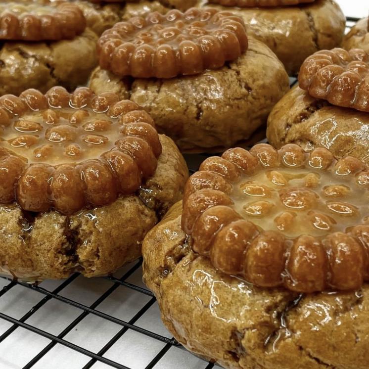 약과 쿠키의 원조는 바로 부산 쿡희네 집입니다. 한정으로 출시했던 바닐라 크림 약과 쿠키가 초대박을 쳐 ‘10평 매장의 기적’이라는 별명이 붙었죠. 한 때 바닐라 아이스크림을 약과에 올려 먹는 게 유행이었던 거 기억하시나요? 그 조합에서 영감을 받아 개발했다고 해요. 바닐라 크림 필링이며, 겉면은 집청으로 코팅된 원조 약과 쿠키의 맛!