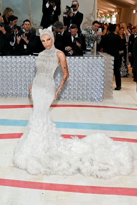 칼 라거펠트가 키우던 하얀 고양이 ‘슈페트’에 대한 찬사를 던지는 것 같은 도자캣의 의상! 그녀의 착장을 칼 라거펠트가 봤다면 아주 좋아했을 것 같아요.