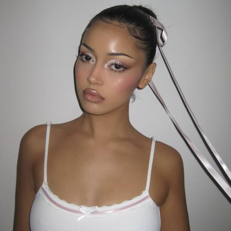 인플루언서 신디 킴벌리의 발레코어 룩과 메이크업! 어린 시절 발레 공연에서 했던 것 같은 펄 아이 메이크업과 새틴 리본으로 묶은 업스타일 헤어가 90년대 동심을 제대로 자극하네요.
