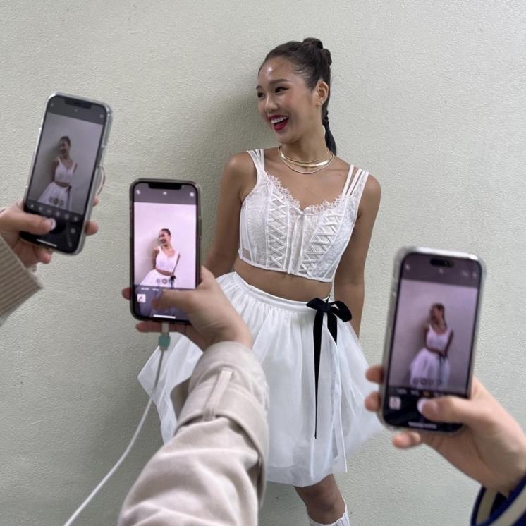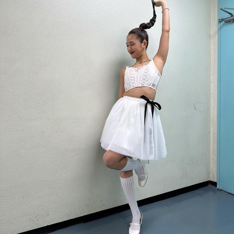 화이트 뷔스티에에 튀튀 스커트, 슈즈로는 메리제인을 매치해 발레 코어 열풍에 합류한 미미. 하나로 볼드하게 땋아내린 헤어와 실버 네크리스로 미미만의 힙함을 한방울 더했어요.