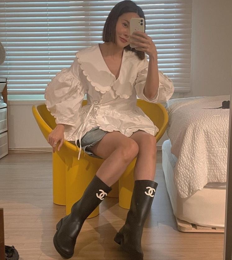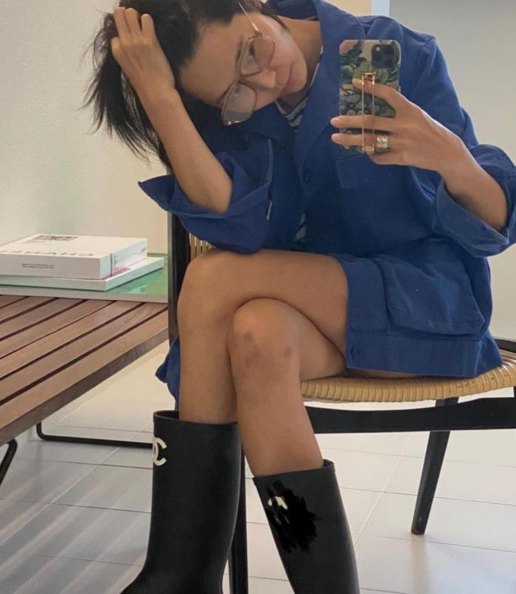 여성들의 워너비! 차정원 또한 샤넬 레인부츠를 선택했다. 앞코의 블랙 포인트가 돋보이는 클래식 무드의 샤넬 레인부츠. 그녀는 크롭 기장의 미우미우 블라우스와 블랙 플리츠 스커트를 함께 스타일링해 깔끔하면서도 키치한 느낌을 완성했다.