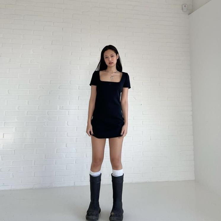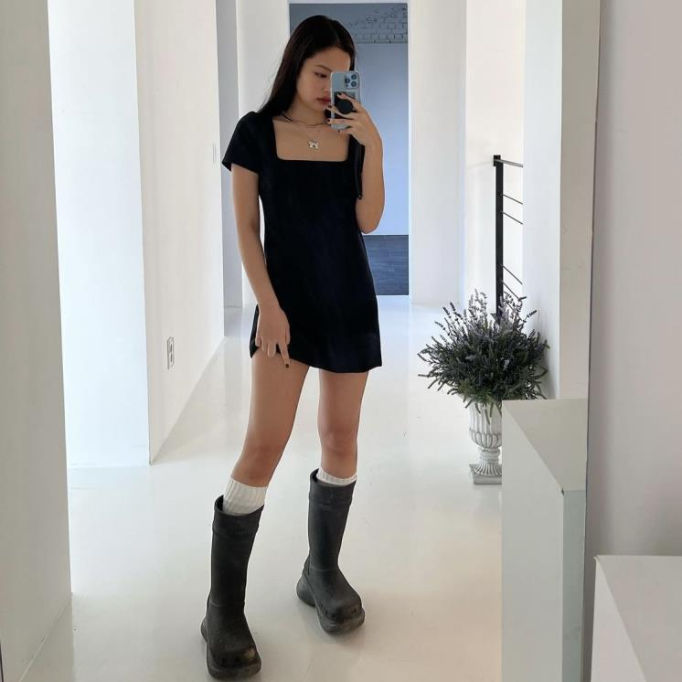 비 오는 날도 끄떡없는 무적 아이템인 롱 레인 부츠! 블랙 핑크 제니는 밑창이 투박한 워커 형태의 발렌시아가 레인부츠를 픽했다. 특히 그녀는 무릎 아래까지 올라오는 긴 양말을 레인 부츠와 매치했는데... 블랙 앤 화이트 포인트가 힙한 느낌을 자아낸다.
