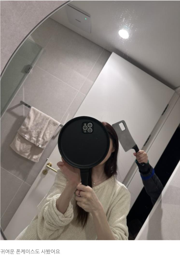 바로 귀엽지 않은 크기의 휴대폰 케이스로 찍은 거울 셀피였다. 심지어 한소희 머리를 겨누는 중식도 모양의 휴대폰 케이스까지 웃음을 준다. 묵직한 휴대폰 케이스 인증 덕분에 간밤에 폭소했다는 팬들의 글들이 이어졌다.