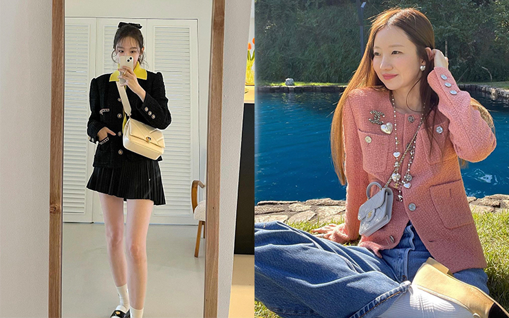사파리 재킷에 플리츠 미니 스커트를 스타일링하고 샤넬 레인부츠를 매치한 오눅. 귀여우면서 활동적인 룩이에요. 일교차가 심한 장마철에 좋을 코디!