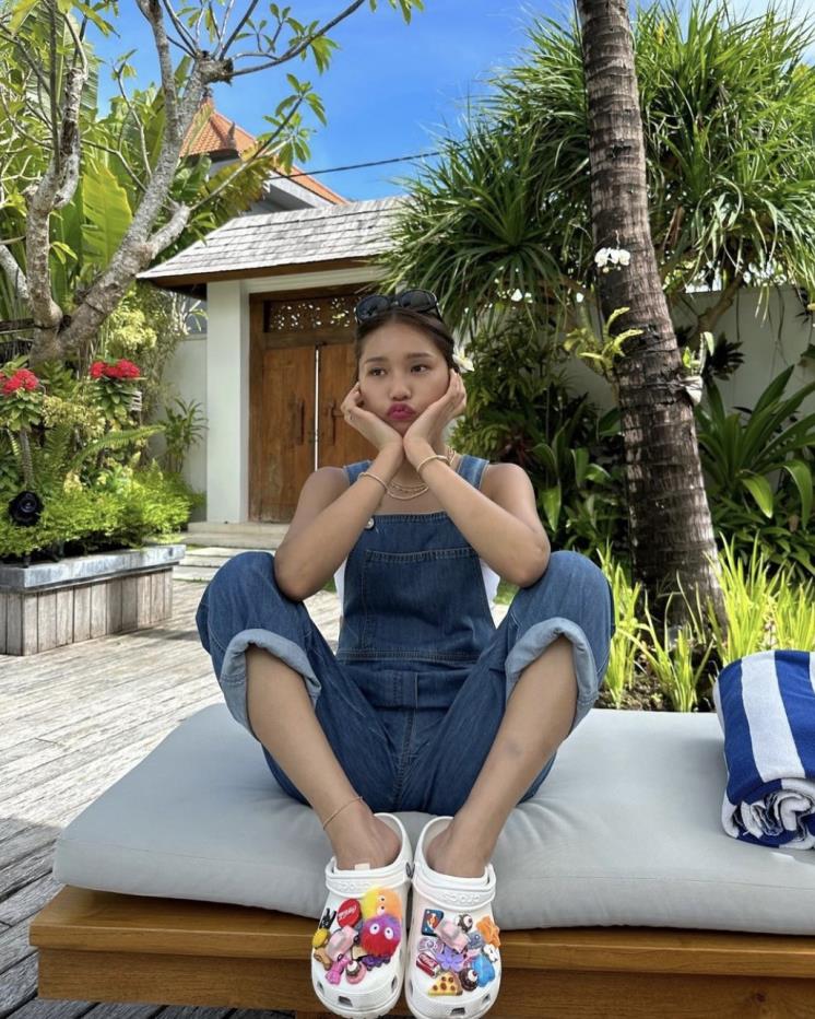 미미의 힙한 오버올 패션! 오버올에 이너로 화이트 컬러의 튜브톱을 매치해 시원한 바캉스 룩을 선보였어요. 어디론가 훌쩍 떠나고 싶어지는 룩이죠?