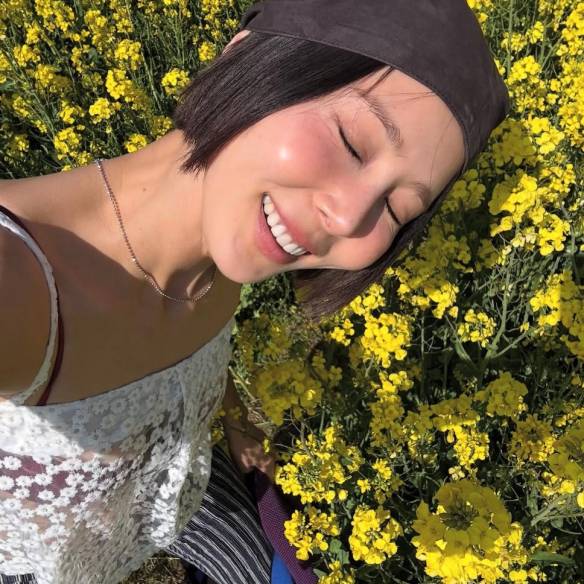 리본 머리땋기의 선두주자 제니. 리본에서 한층 더 나아가 장미, 까멜리아 등의 플라워 헤어 액세서리를 활용하고 있습니다. 밑 부분은 앙증맞은 작은 리본으로 포인트를 주었네요.