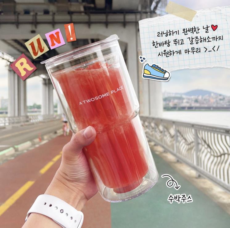 투썸 플레이스 수박 주스도 직접 수박을 갈아넣어 만든다. 투썸만의 트레이드 마크는 주스 위에 올려진 수박 조각들! 이디야와 비교했을 때, 이디야는 더 사각사각한 스무디 식감이라면 투썸플레이스는 더 주스같은 느낌이 강하다고. 레귤러 사이즈는 190칼로리.