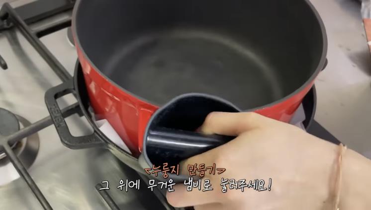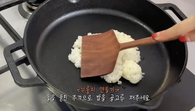 3. 덜어낸 밥을 프라이팬에 최대한 얇게 피고, 그 위에 종이 호일과 냄비를 올려 납작하게 굽는다.