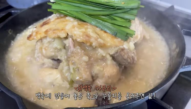5. 죽과 누룽지를 백숙에 올리고 그 위에 부추까지 올리면 완성!